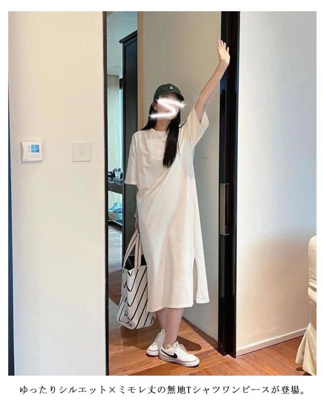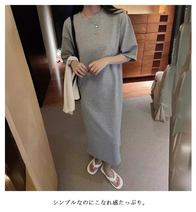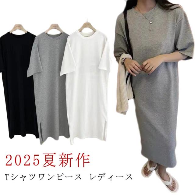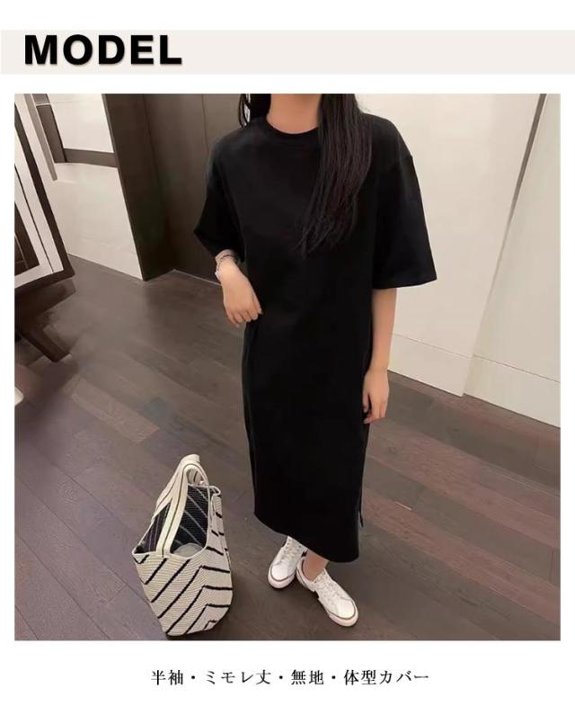 Tシャツワンピース Tシャツワンピース 半袖 ミモレ丈 ゆったり ルームウェア 部屋着 無地 シンプル ロング丈 レディース カットソー ワンピース カジュアル 体型カバー サイドスリット 春 夏