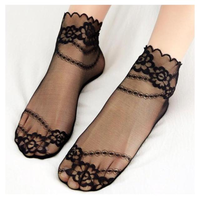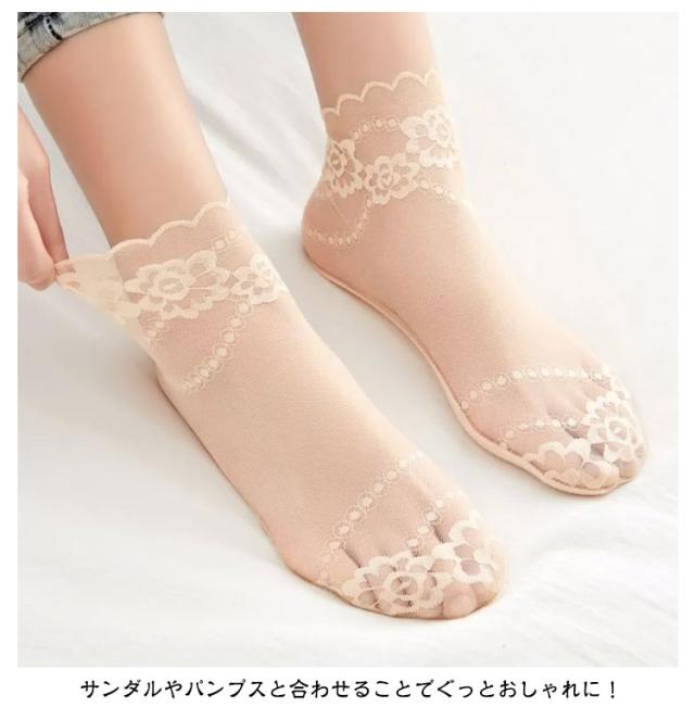 | 女性らしさを一層引き立たせてくれるシースルーレースソックスです。【5足セット】 透け感のあるデザインは夏でも涼しく履いていただけます。 サンダルやパンプスと合わせることでぐっとおしゃれに! ソフトで軽いシアー素材が足を包み込むから、ずっと快適でいられる。 伸縮性も良く、ソフトな肌触りの履き心地・フィット感。 軽量&薄地で瞬冷通気。暑い季節もヒンヤリ爽やかなはき心地! | |