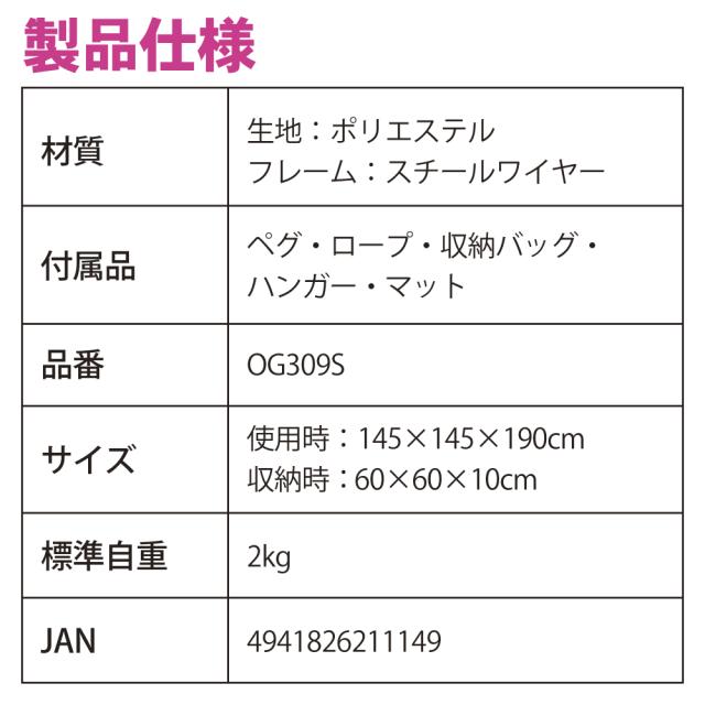 付属品:ペグ・ロープ・収納バッグ・ハンガー・マット