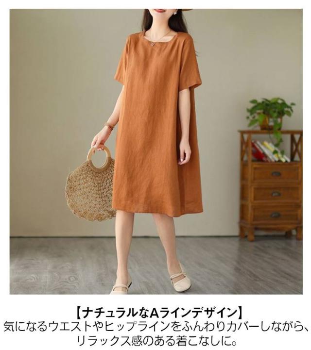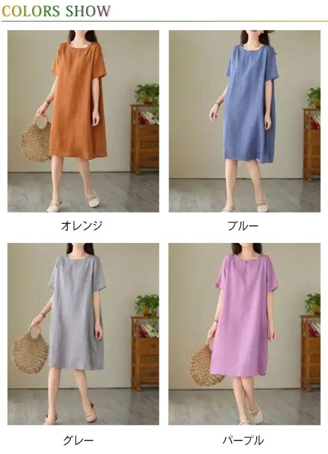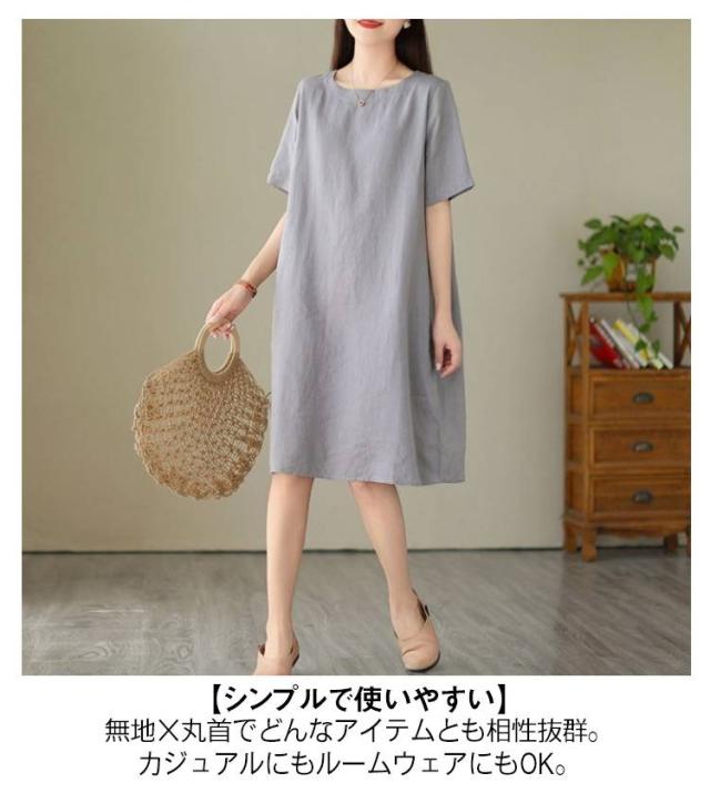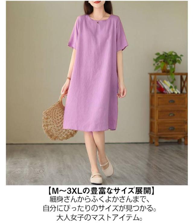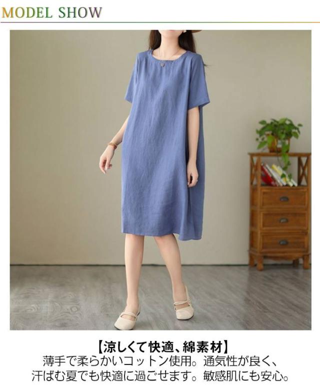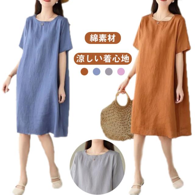 ゆったり 夏用 コットン 丸首 半袖ワンピース 大きいサイズ シンプル 無地 体型カバー ワンピース 膝丈 カジュアルワンピース ミディアム ナチュラル 夏