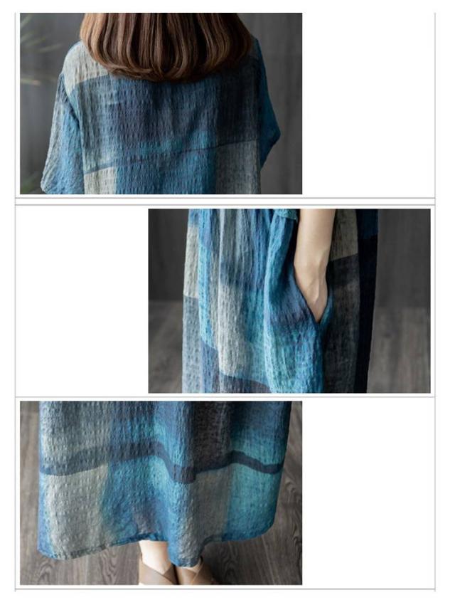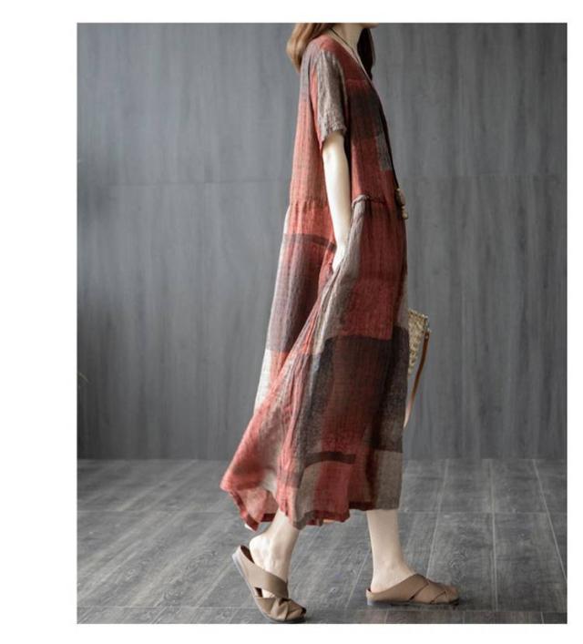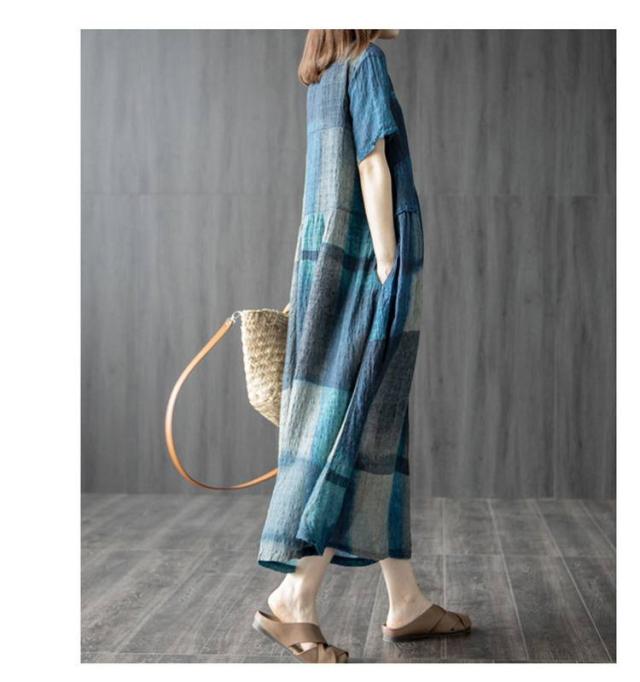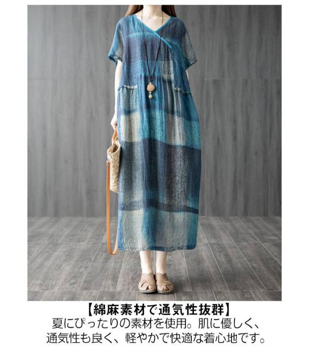 ゆったり 夏新作 ワンピース 半袖ワンピース 切り替え レディース チェック柄ワンピース ロング丈 綿麻ワンピース チェック ワンピース ナチュラル 可愛い