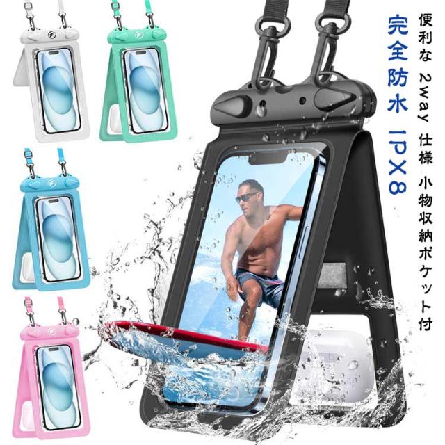 2wayポケット小物収納付 ケース 防水スマホケース 防水ケース 7.5インチまで対応 防水 2wayポケット小物収納付 付 白 スマホ防水ケース ストラップ IPX8 完全防水 海 スマホ プール お風呂 携帯 可愛い スマホケース
