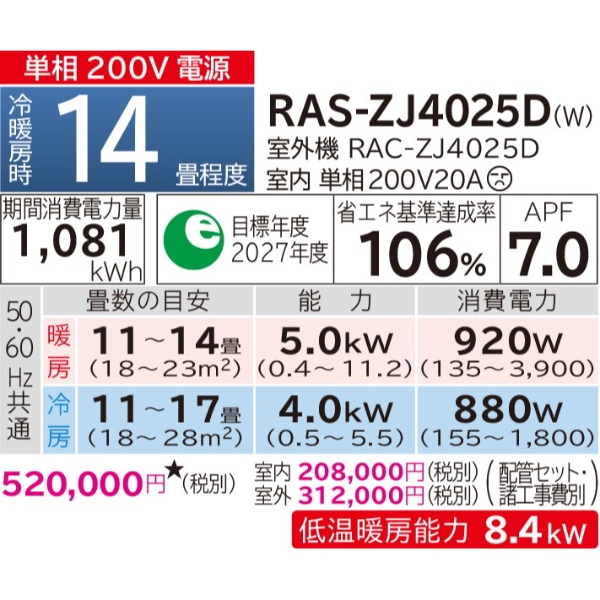 【2025年度モデル】日立 ルームエアコン 白くまくん ZJシリーズ [凍結洗浄 除菌ヒートプラス]・[ファンお掃除ロボ]・[カビバスター]搭載ハイグレードモデル ■単相200V 20A エルバー型 ■畳数の目安… ・暖房:11〜14畳(18〜23m2) ・冷房:11〜17畳(18〜28m2) ■能力… ・暖房:5.0kW(0.4〜11.2) ・冷房:4.0kW(0.5〜5.5) ■消費電力… ・暖房:920W(1135〜3,900) ・冷房:880W(155〜1,800) ■外気温2℃時暖房能力:8.4kW ■期間消費電力量:1081kWh ■省エネ基準達成率:106% ■AFP:7.0 ■室内機サイズ:幅798x高さ295x奥行385mm ■室外機サイズ:幅859(+97)x高さ709x奥行319(+68)mm ■室内機質量:16.5 kg ■室外機質量:39kg ■最大配管長:20m ■配管最大高低差:10m ■使用配管:2分3分配管 ※室外機の( )内寸法は、バルブや固定足までの寸法を表します。 ※記載は商品仕様の一部です。仕様説明不足等の理由での返品はできません。特に適合等は必ずご確認ください。