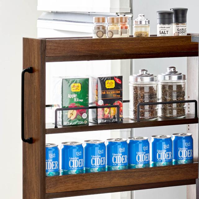 隙間収納ワゴンには珍しいプリント紙化粧パーティクルボード製で、木目調のものもあります。キャビネットやシンク扉の色に合わせるとキッチンのインテリアにも自然と溶け込み、生活感を感じさせません。