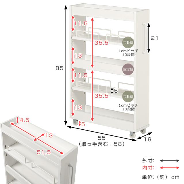 隙間収納ワゴン 幅16cm ロータイプ キャスター付 ( 隙間収納 ワゴン 収納 棚 ラック キッチン ストッカー 省スペース 可動棚 ブラウン ナチュラル ホワイト すき間 )