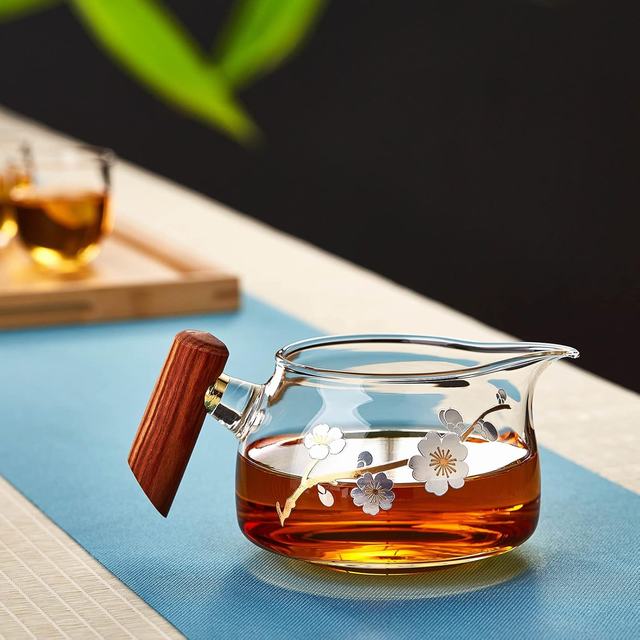 ●このガラス急須茶海(公道杯)はホウケイ酸ガラスを使って作ります、ホウケイ酸ガラスは、瞬間的な温度変化に耐えられて、温度範囲は−20℃から150℃までです、熱膨張係数3.3、他のガラスよりも熱衝撃に耐性があります。高強度、高硬度、高光透過率を持っています。そのため、どんなシーンでも使える美しい茶海です。●ガラス公道杯の外側にある桃の花の模様は高温焼成で作られたレリーフ状となっており、褪色しません。木製のハンドルは持ちやすく、火傷の心配もありません。形も優美で、繊細で質感溢れるおつくりとなっています。お茶を注ぐと、ガラスに描かれた花の模様とともに美しくお茶を楽しむことができます。●ガラスの材質はとても厚く、なめらかな質感です。注ぎ口は丸く滑らかで、滑らかな注ぎ心地を提供します。注ぐときに垂れない、スムーズな注ぎ心地、便利な操作性。お茶を注ぐとき、お好みのタイミングでぴたっと止めることができます。お茶が垂れたりこぼれたりしません。●丈夫、直火対応、お湯を沸かすこともできます、直火(弱火)対応、急激な冷却?加熱にも割れることはありません。
