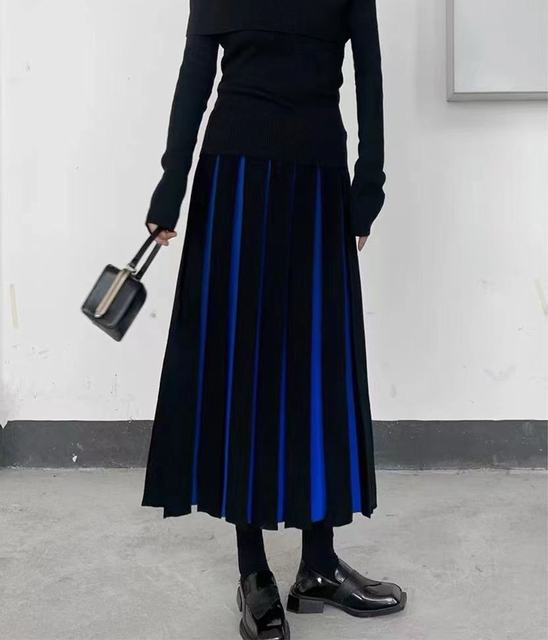 プリーツスカート ロング丈 ニット 秋冬 レディース ストライプ Aライン バイカラー ニット 2color切り替え 体型カバー ブルー