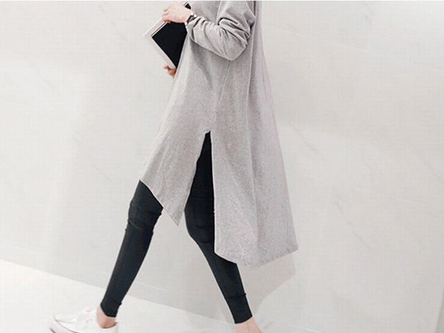 スリット ワンピース Tシャツ 長袖 レディース サイドスリット チュニック 無地 トップス 大人 可愛い シンプル グレー