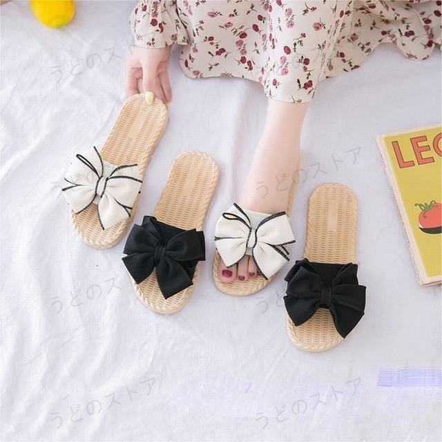 【ホワイト/黒 23.5cm~25cm】夏 人気 デザイン 黒リボン 軽量 サンダル 蝶結び