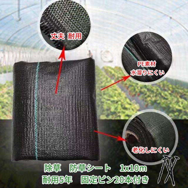 商品詳細坪量 :約80g/m2耐用年数:約5年材質 :ポリプロピレン16cm固定ピン20本付き化学薬剤未使用。環境や土壌に負担をかける化学薬品は一切使用していません。業務用向けに開発された防草シートです。耐用年数が約5年と長持ち。通常の防草シートと比べ、約2倍以上長持ちする耐久性の高い仕様になります。丈夫な防草シートです。シートに雨水がたまりにくい。厚手で丈夫なシートにより遮光性が高い反面、シートの裏面に水がしみ通る平織りとなっております。雨水がシートの上にたまり見栄えが悪くなることを防ぎます。