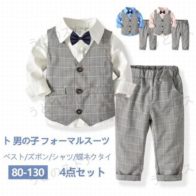 商品詳細:■素材: コットン?ポリエステル■4点セット:ベスト×1、ズボン×1、シャツ×1、蝶ネクタイ×1シンプルでカッコいい4点セット お得な子供服のフォーマルスーツです。?ベストは大人っぽいのチェック柄デザインです。ウエストゴム仕様で着脱が楽です。また,ポケット付きです。入園式 卒園式 結婚式 披露宴 二次会 誕生日 バースデー パーティ お呼ばれ イベント 七五三 の 記念撮影 など様々な正式場面で大活躍です。■ご注意●実寸はメジャー採寸の為、若干の誤差が生じる場合があります。●色合いはモニター環境により若干の誤差が出ます。
