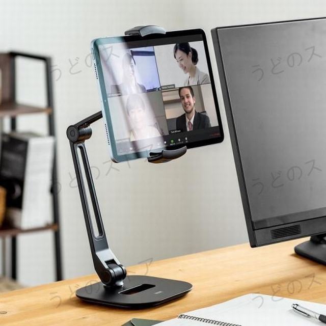 13インチのタブレットを設置できるタブレットアームスタンドです。ホルダー部分は伸縮可能でバネの力でしっかり挟み込みます。(可動範囲148 225mmまで)回転?角度などの調整が可能です。2関節アームで高さの調整も可能です。ブラケット挟み込み部は、ケーブル口になっているので充電ケーブルを繋いで挟み込む事も可能です。ブラケットの台座部は360度回転でき、前後方向が変えられ相手側に向ける際も便利に使用できます。台座裏面には滑り止め付きです。重量:約1.4kg総耐荷重:1kgアルミ、スチール(スタンド、アーム部)ABS樹脂、シリコーンゴム(ホルダー部)対応機種:12.9インチ iPad Pro(2018/2017)/11インチiPad Pro/iPad Air 第4世代(2020)/10.2インチ iPad 第8世代(2020)/iPad Air(2019)/9.7インチ iPad(2018/2017)/iPad mini(2019)/などの6?13インチ程度までで、幅148?225mm、厚さ18mm、重量1kgまでのタブレットPC