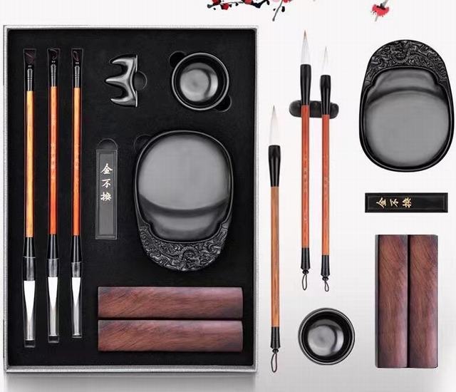 書道は精神を集中させることが期待でき、その結果心を落ち着かせる効果があるとも言われています。書道に必要な文房四宝(筆、硯、墨、紙)の中、紙以外が揃っています。セット内容:筆3本硯1個墨1本文鎮2本筆置き1個水皿1個また、固形墨は墨の伸びがよく、半紙にきれいな文字が書きやすい松煙墨を使用しております。どれも大人の書道用具として最適です。道具が一通り揃うので趣味入門や初心者にもお勧めの一式セット。また、書道、習字、写経、水墨画など本格的な大人のための書道用具としても最適です。落ち着いたシンプルなデザインなので、趣味として書道を始める大人の方から、お子様へのプレゼントとしても喜ばれます。半紙と下敷き以外の道具一式が全て揃っているので、手に届いたその日からすぐにでも始めることができます。硯や文鎮をはじめとしてデザインはどれも本格派。大人の書道具として、一つ一つ丁寧に仕上げた逸品です。職人が丹精込めて仕上げたハンドメイドの筆は、長くご愛用頂けるよう丈夫で筆が引きやすい、やわらかい羊毛筆を採用しています。