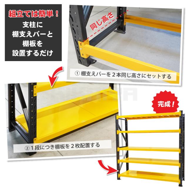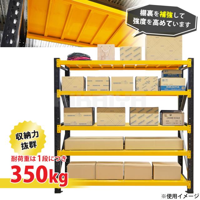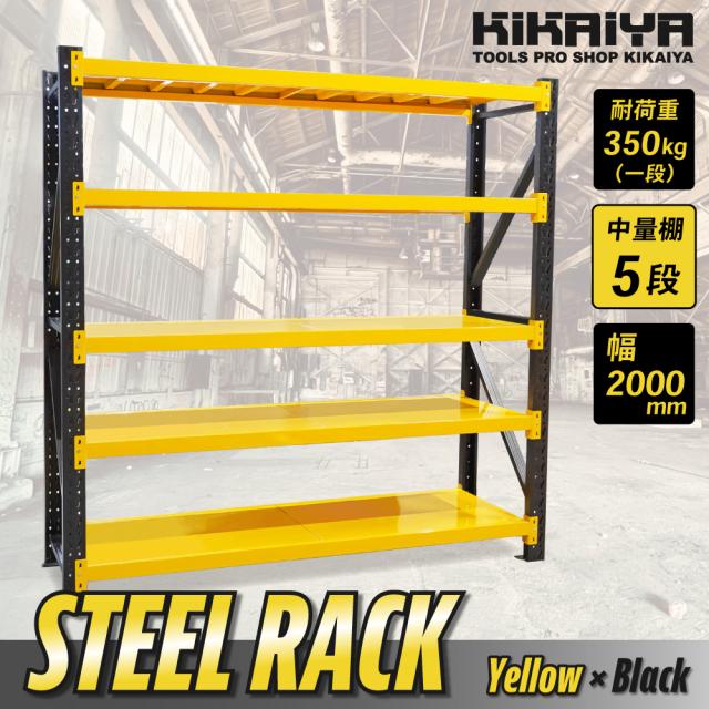 スチールラック 5段 ボルトレス イエロー×ブラック ワイド幅 業務用 収納棚 中量棚 メタルラック 耐久性あり 350kg 頑丈 高強度 幅200×奥行60×高さ200cm KIKAIYA