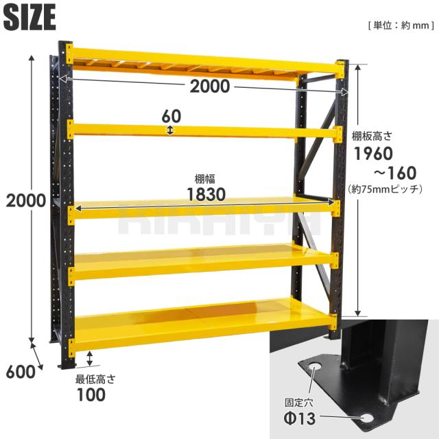 | 組立サイズ | 幅200×奥行60×高さ200cm | 耐荷重 | 全体 1750kg/各棚 均等350kg | 鉄板厚 | 0.6mm |
