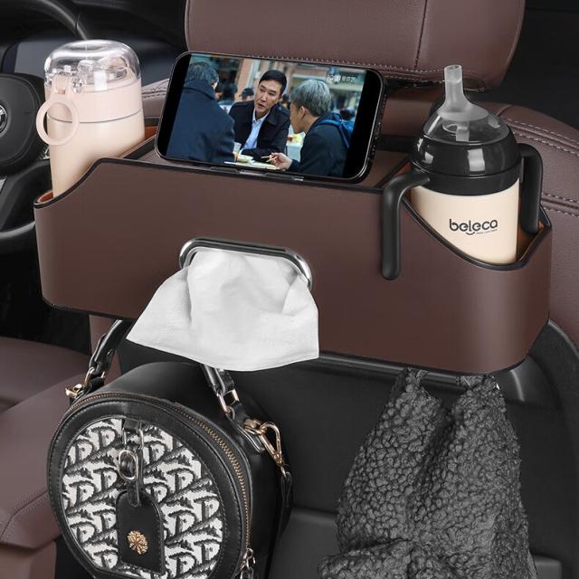後部座席収納 カップホルダー付き カーシートバック 小物入れ カバンホルダー ティッシュ箱あり 簡単取付 車内収納用品 ブラウン