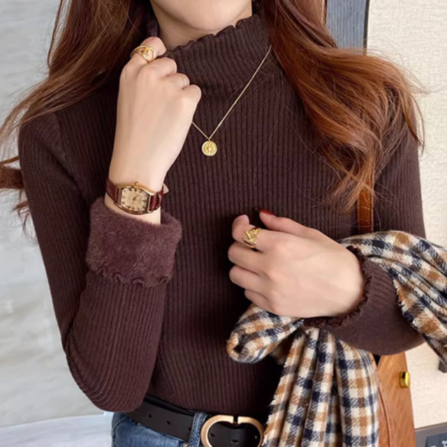 リブニット ニットトップス インナー ニットソー ハイネック 長袖 裏起毛 フリルネック 無地 秋 冬 あったか 暖か コーヒー