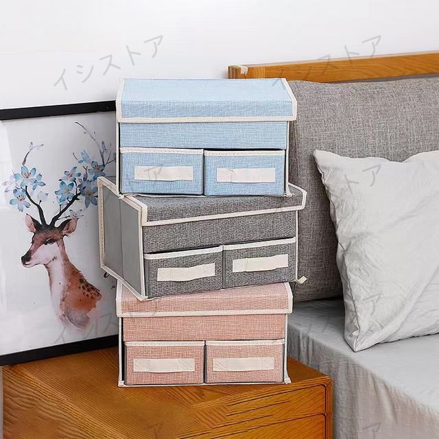 【製品サイズ】掲載サイズ表をご参照ください。【長持ちできる材質】ボックスの外は綿麻布材質、汚れにくく、耐摩耗度が高く、耐久性がいい。裏は不織布、通気性が良く、ソフトで収納している物に傷つきません、長持ちで環境に優しいです。【引き出し収納】二段式デザインの収納ケースで,ふたが付いてます。上のマジックテープによりしっかり閉まり、虫や埃などが中に入りにくい。下部の段ボールには、簡単に取り外せるように小さなハンドルが付いています。防黴、防湿という効能があり、耐久性にも優れています。ボックスの中には厚紙の芯材で変形しにくいです。 【組み立て簡単&省スペース】収納ケースは、折り畳む可能な三つ部分で構成されています、底板を置けば簡単に組み立てできる、使わないときには折畳んて押入れや家具の隙間などに収納して空間節約。【広がる用途】下着だけでなく、ストッキングや靴下、ハンカチ、ミニタオル、ブラジャーなどを分類して収納できます。化粧品など収納、キッチン周りの調理小道具収納、リビング周りのテレビリモコン、文房具、お薬などの小物収納や仕分け収納ボックスとして使用できます。