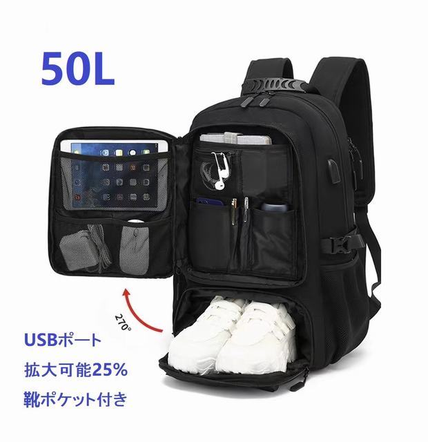 リュックサック デイパック 大容量 ポケット多数 仕切り PCバッグ USBポート 拡大可能 防水 靴ポケット付き キャリーオン 出張 50L