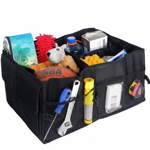 サイズ:掲載写真をご参照ください。容量は約50L収納箱に取っ手がついてますが2ブロックに分けて使用しています。使用目的別に仕分けが可能です。両側には取っ手が付いているため、重たい荷物でもそのまま持ち運びができて便利です。折り畳み式ですので、使用しない時はコンパクトに収納することが可能です。サイドにポケット多数がございますので,用途別に分けてご利用頂けます。素材:高密度素材の「600Dオックスフォード」を採用した丈夫で耐久性に優れた収納ボックスです。撥水加工が施されているためお手入れも簡単です。濡れたタオルや洗剤で汚れを拭き取ることができます。整理整頓:用途が広く実用的な車の収納ボックス、すべてを適切な場所にきちんと収納できます。車用品、洗車用具、掃除道具、買い袋、釣具、運動用品の収納に最適です。