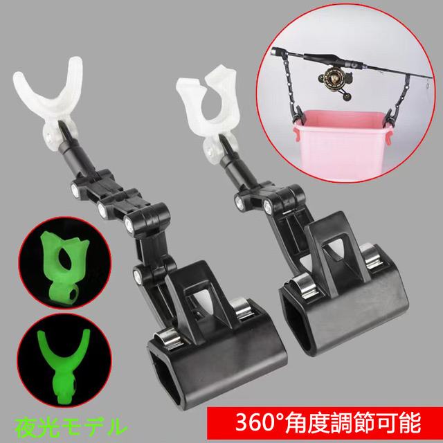 注意事項:夜光モデルなので、先端はホワイト(透明)です。写真掲載中の全体黒のタイプではございません。ご了承ください。サイズ:掲載サイズ表をご参照ください。夜光タイプなので、夜釣りの時にも重宝します。魚外しやエサ交換時など、少しの間竿を置きたい時など、この竿置きが大活躍です。 強力なクリップで、釣竿をバッカンやバケツに挟んでご利用になります。360度調整可能なので、使い勝手がよく便利です。ネック部分は多関節アームで微妙な角度調整が可能です。
