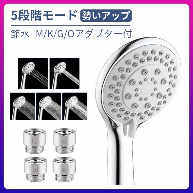 シャワーヘッド 増圧 5段階モード シャワー 勢いアップ 頭皮ケア 清潔 バスグッズ アダプター付 M/K/G/O 取り付け簡単