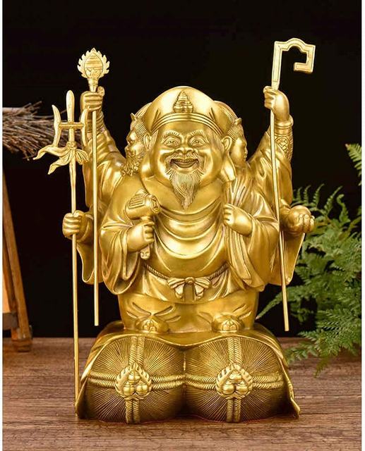 サイズ:頭上迄の高さ10×幅6.5×奥行5.8cm (手測りのせいで、少し誤差が存在する可能がございます)原材料:銅製(真鍮)大黒天は、ヒンドゥー教のシヴァ神の化身であるマハーカーラのことで、戦闘をつかさどる神でしたが、次第に財宝をもたらす力が知られるようになり、各地の豪商が守護神としました。富や出世、繁栄をもたらす招福?金運の神です。“三面大黒天”は、護国豊穣の福の神《大黒天》、必勝と財運の福の神《毘沙門天》、福徳財宝と技芸?教養の福の神《弁財天》という単独でも強力な天部が三位一体となった最強の福の神です。 六本のお手には衆生の福徳を叶え、苦難を除く様々な道具を持っているのが特長的な像形となります。縁起がよい三面大黒は誕生日?記念日? 引越し?就職?移転転勤?開業のプレゼントに適しています。