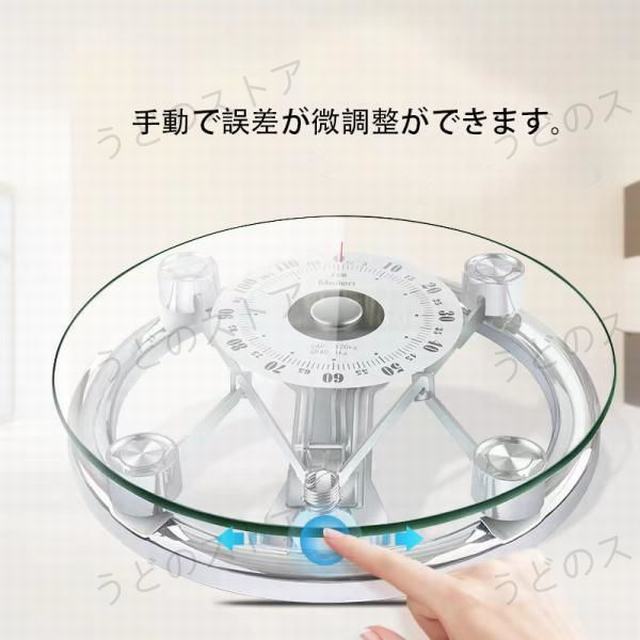 サイズ:掲載サイズ表をご参照ください。重量:約3.4kg 計量可能:約1kgから約120kg 素材:強化ガラス、高強度金属手動で誤差が微調整ができます。 スタイリッシュなクリアデザインの体重計です。見やすいアナログ表示になります。感覚的に体重が一目でわかりやすい仕様になっています。昔ながらのアナログタイプなので現在の体重を把握しやすく、直感的に分かります。日常的に体重を測定される方や健康が気になる方 また、お子さまの居るご家庭にもオススメです。120キログラムまで測定可能です。1キログラムから120キログラムまで計測でき、幅広い重量に対応しているので、家族の多いご家庭や旅館、銭湯などの設置にもおすすめです。インテリア性に優れており、世代を問わずにお使いいただけます。電池不要。アナログなので、電池や充電がいりません。電池切れや充電切れがないので、日常的に毎日使えます。スッキリデザインなので置き場所に迷うことなく、リビングやキッチンにも設置することが出来ます。※モニターの環境により、色の見え方に若干差が生じる場合がございます。