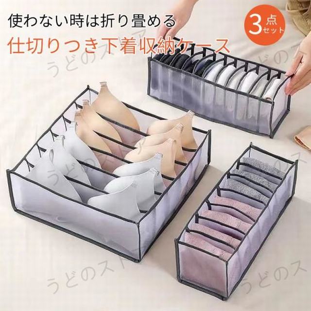下着、靴下、ブラジャーなどの収納にもう困らない!!仕切り付きの下着収納ケース3点セット6マス?7マス?11マスの3点セットだから様々なサイズに対応できます。入れるだけで整理整頓完了。男女ともに下着からトップレスまで様々な衣類に対応。仕切りには通気性の良いメッシュ式。使わないときは畳めるので場所も取りません。汚れがある時は洗濯可能です。サイズ:写真をご参照ください。
