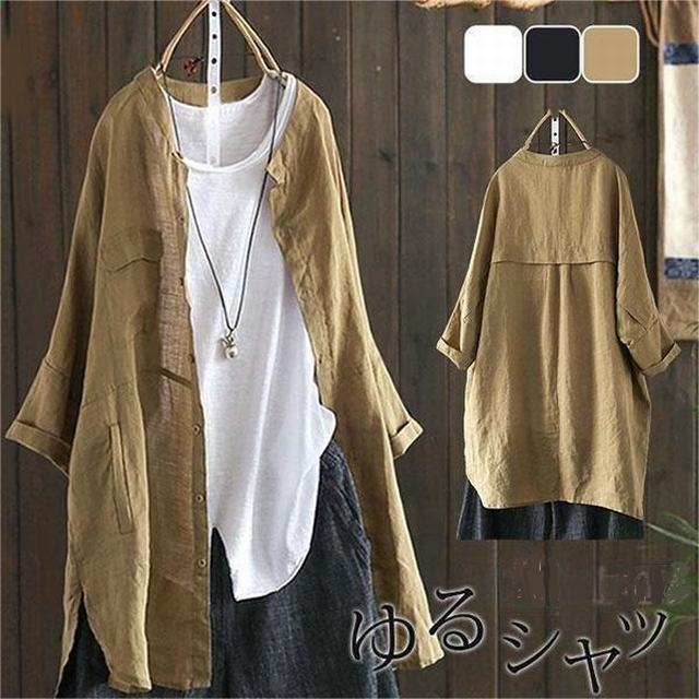 シャツ レディース ブラウス トップス 綿麻 麻混 羽織 ゆったり ロング カジュアル 着痩せ 春秋 体型カバー