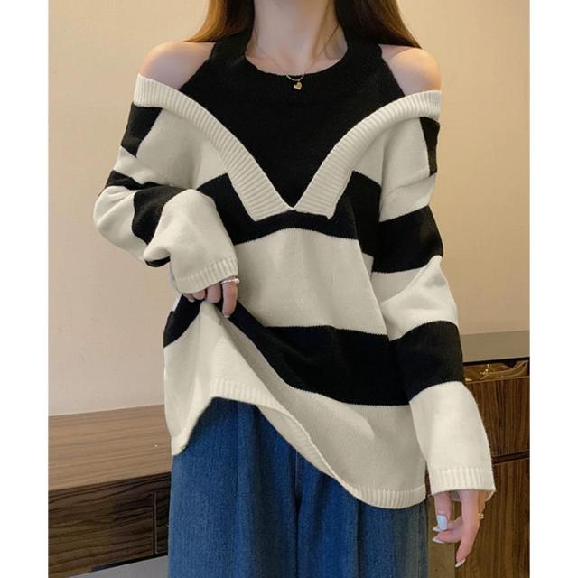 肩開き ニットプルオーバー レディース レイヤード風 ニットセーター 重ね着風ニットトップス 肌見せトップス バイカラー