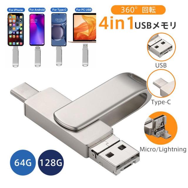 【キーワード】サUSBメモリー 4in1 128GB 64GB iPhone Android PC対応 ライトニング 大容量 容量不足解消 コンパクト 高速転送 パソコン用 携帯用 スマホ用 USB3.0 シンプル 容量拡張 データ転送 フラッシュメモリ 携帯用 type-c 容量不足解消 回転