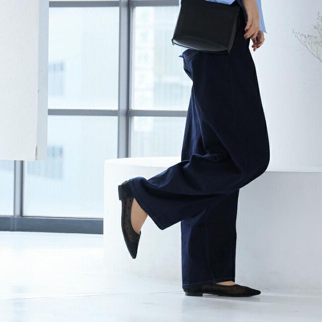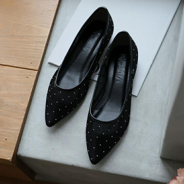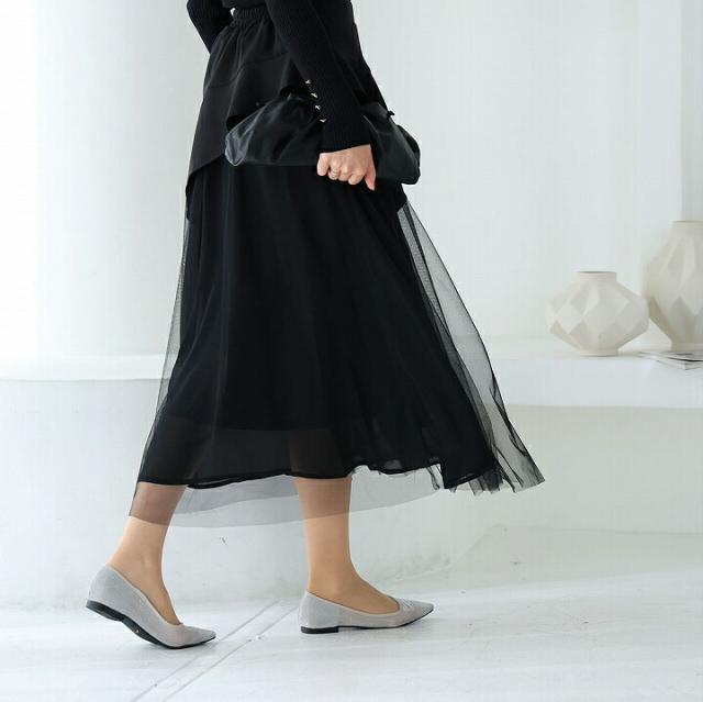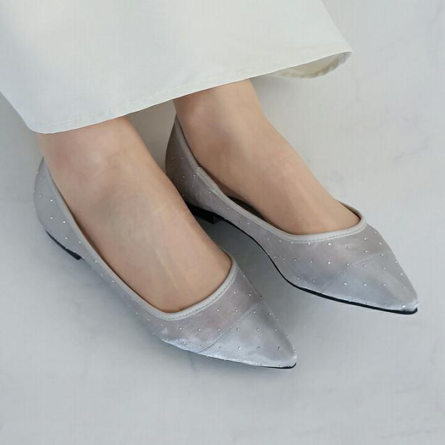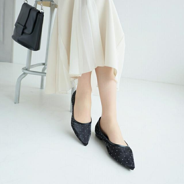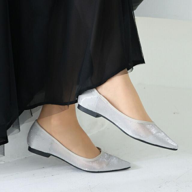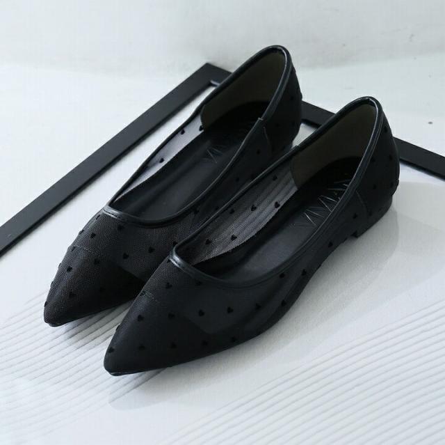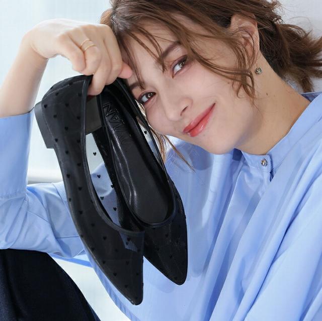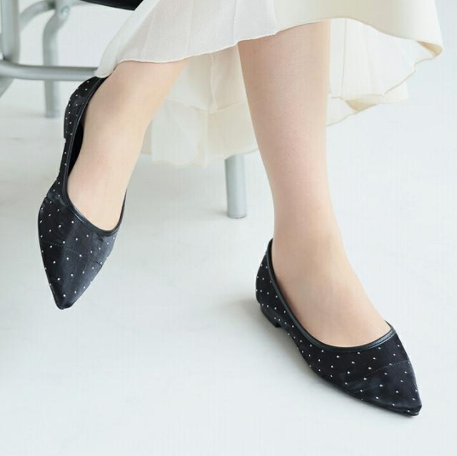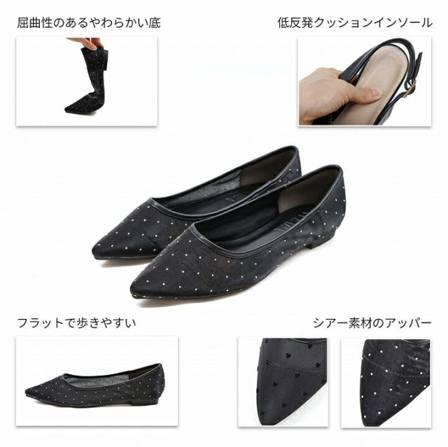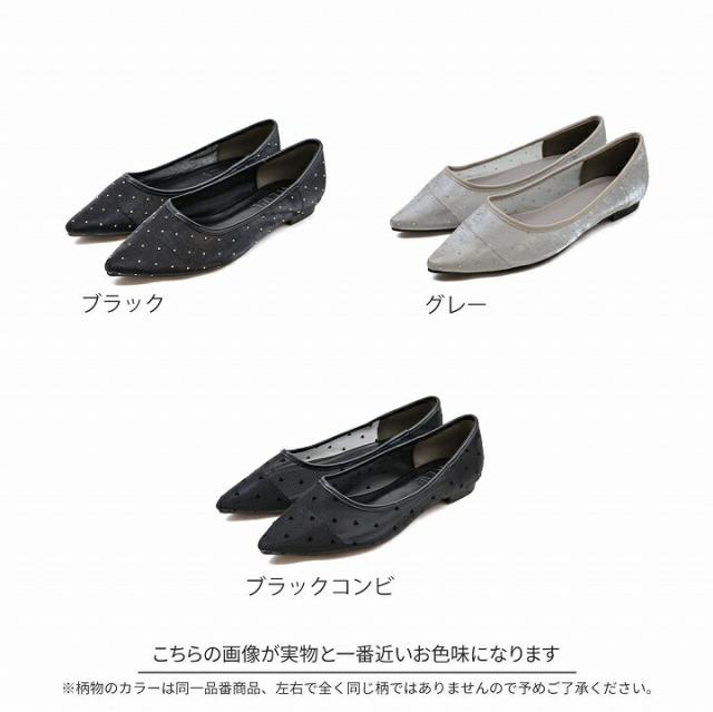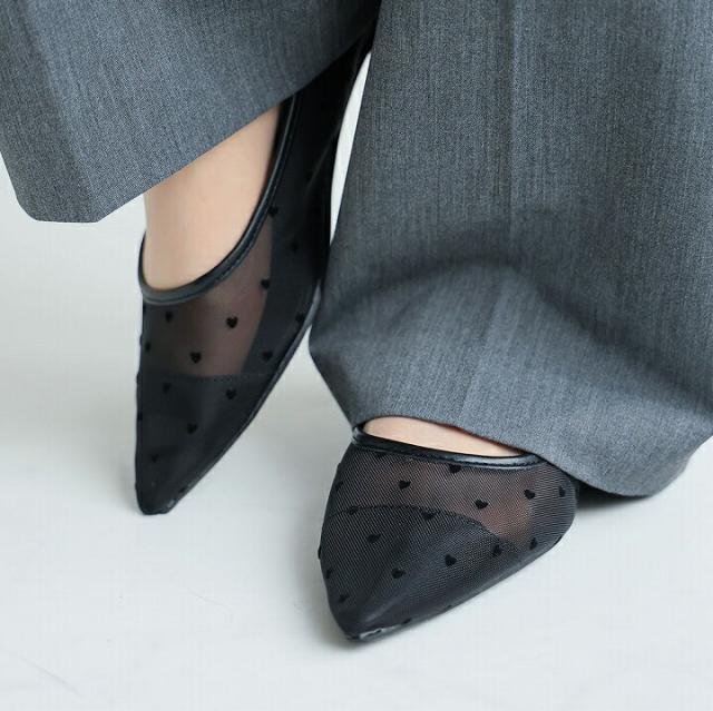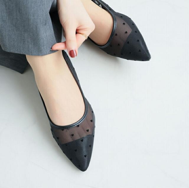 【全品10%OFFクーポン】パンプス 痛くない ポインテッドトゥ チュール シアー素材 ドット ハート柄 フラット ローヒール ブラック 黒 グレー V1784AL