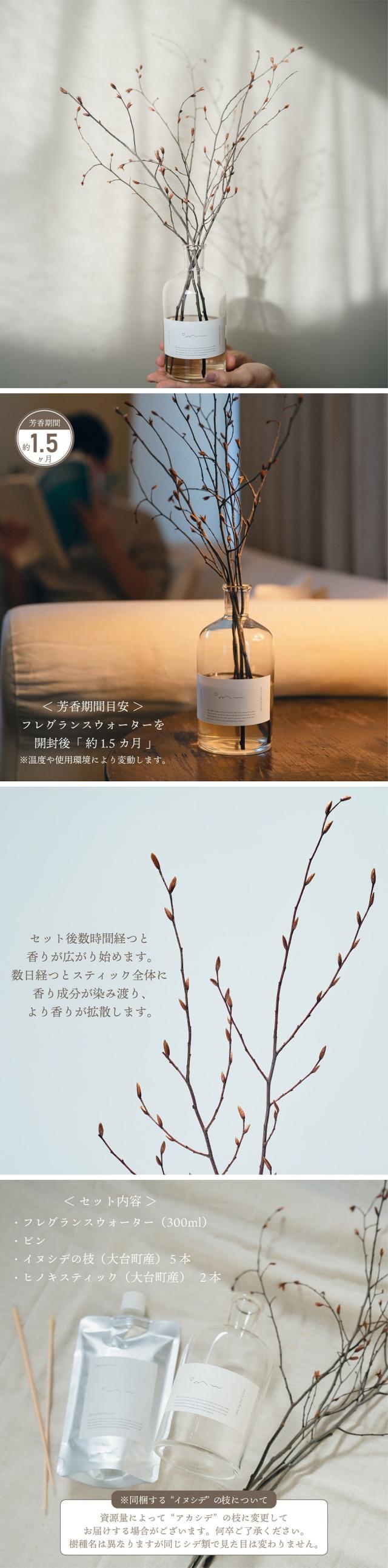 ・枝の色素が抜けフレグランスウォーターが黄色または茶色に濁る場合がございますが、品質上問題はございませんので安心してご使用ください。