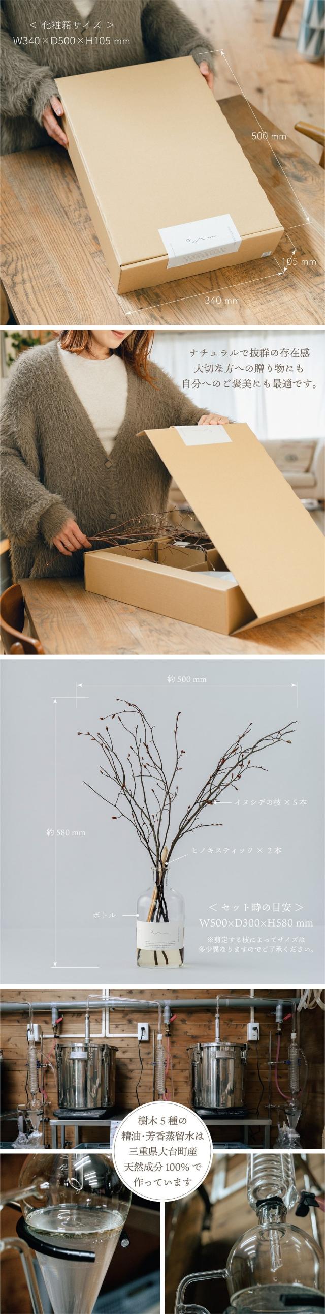 大台町産の5種の樹木クロモジ,タムシバ,ヒノキ,カナクギノキ,スギから抽出した芳香蒸留水をベースに天然香料のみでブレンド