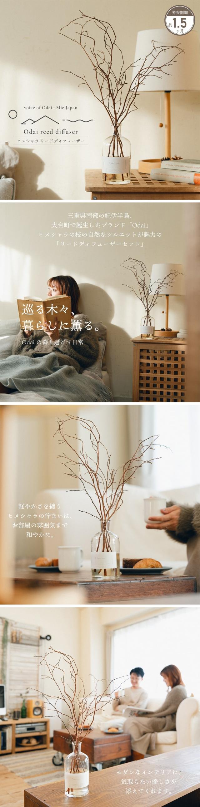 三重県南部の紀伊半島大台町で誕生したブランド「Odai」。豊かな自然から生み出されたヒメシャラの枝の自然なシルエットが魅力のリードディフューザーセット