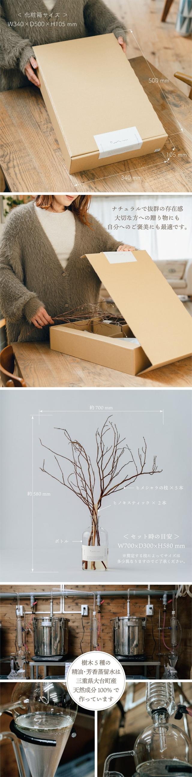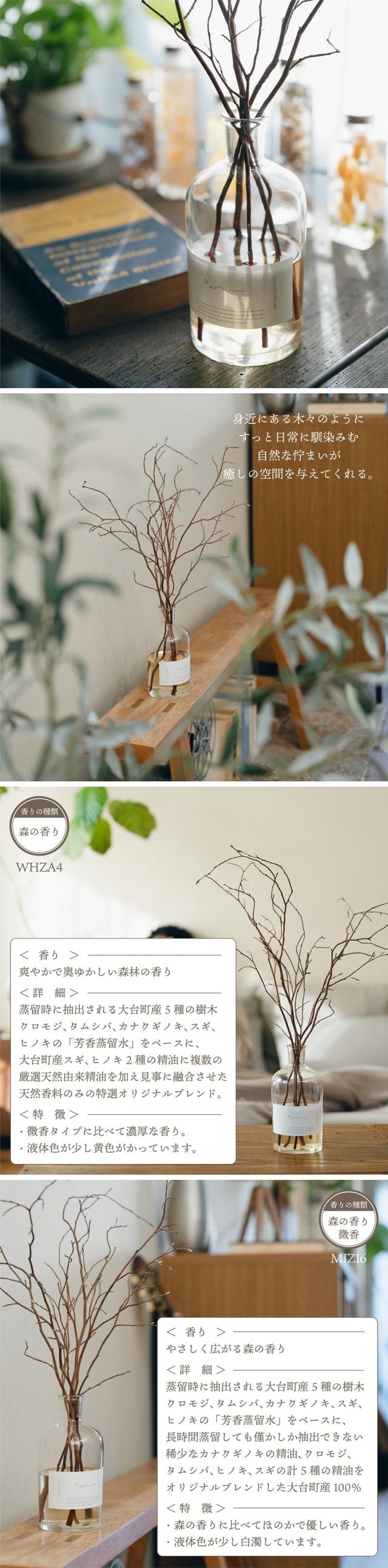 大台町産の5種の樹木クロモジ,タムシバ,ヒノキ,カナクギノキ,スギから抽出した芳香蒸留水をベースに天然香料のみでブレンド