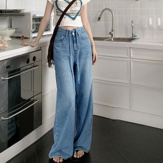 ストリングデニム ワイドパンツ トレロ ゆったり ハイウエストパンツウエストクロス 美脚カジュアル ストレートジーンズ
