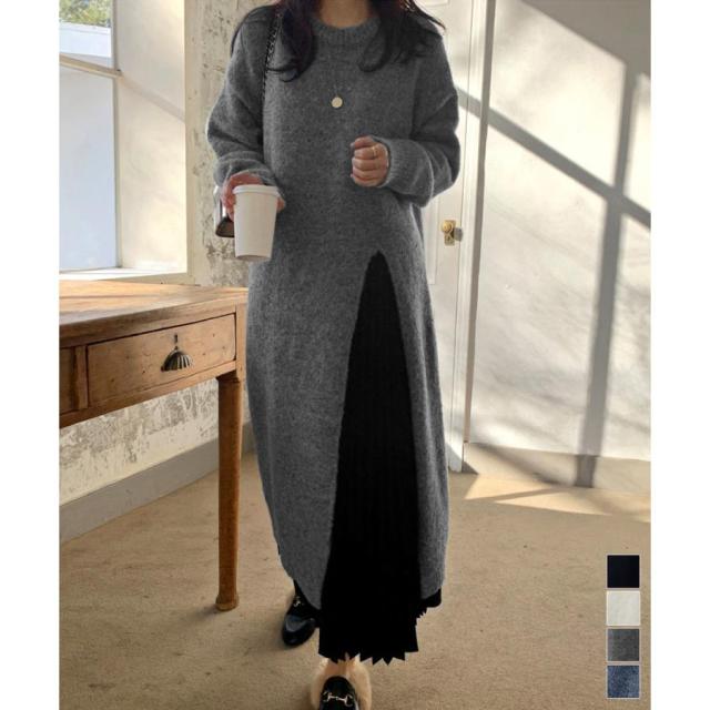レディース おしゃれ ロングワンピース 長袖 ラウンドネック ワンピース ゆったり 体型カバー Iラインワンピ韓国 無地