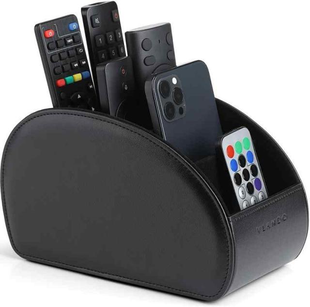 Vlando リモコンラック PUレザー 大きいサイズ リモコン収納 テーブル 5格仕切り リモコンスタンド おしゃれ 防水 (ブラック, オーバル)