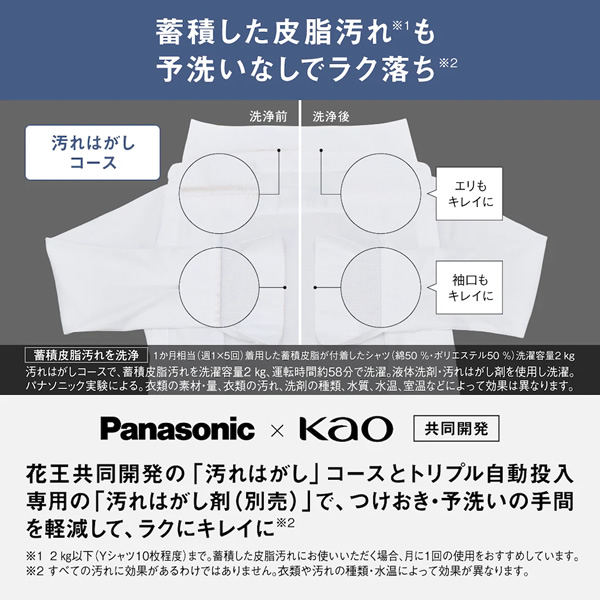 花王共同開発の「汚れはがし」コースとトリプル自動投入専用の「汚れはがし剤(別売)」で、つけおき・予洗いのの手間を軽減して、ラクにキレイに。