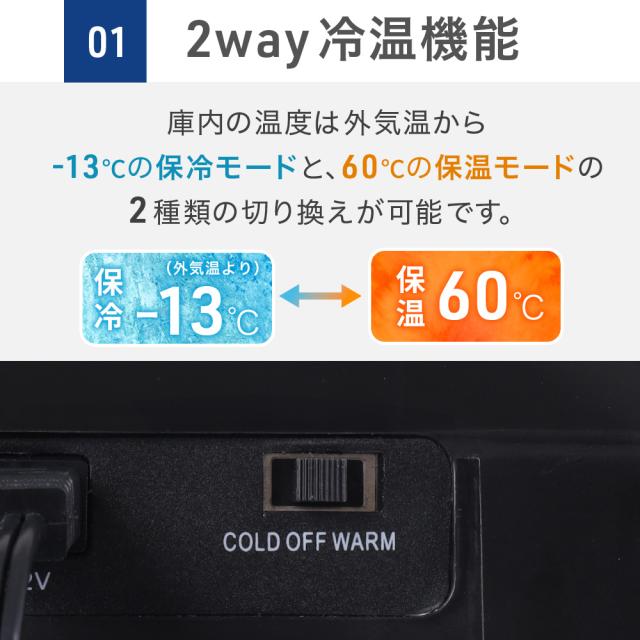 庫内の温度は外気温から-13℃の保冷モードと60℃の保温モードの2種類の切り替えが可能です。