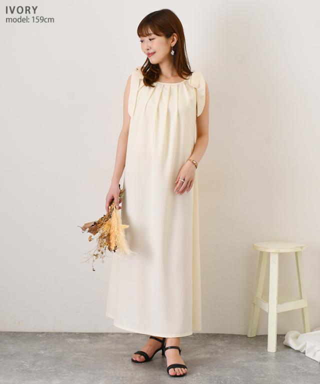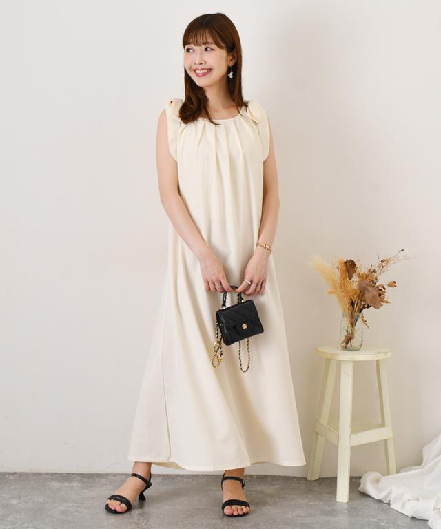 新作 リボンショルダーバックオープンノースリーブロングワンピース レディース 夏 きれいめ 上品 ロング丈 マキシ丈 Aライン 旅行 リネンタッチ 肩リボン リゾート バックシャン 可愛い 大人可愛い スタイルアップ