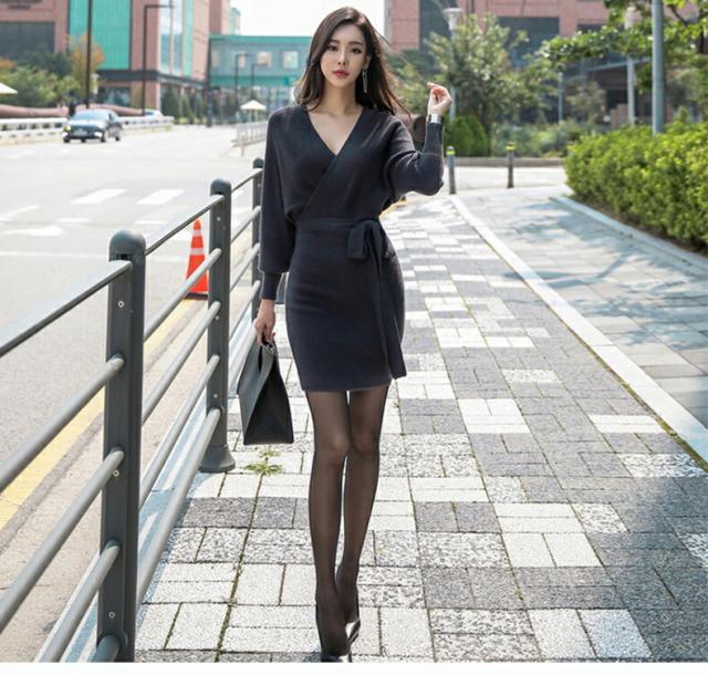 タイトワンピース 姫系ワンピース 秋ニットミニ ワンピース インポートミニ丈 ニットワンピース パーティドレス カシュクール 長袖 お嬢様 セクシー ミニワンピース 上品 オフィスレディー F5 OL