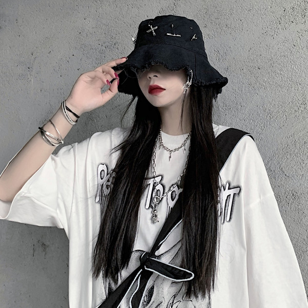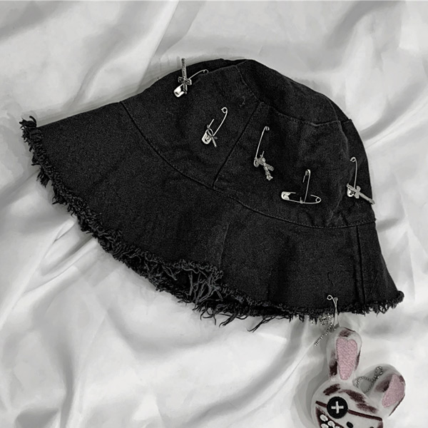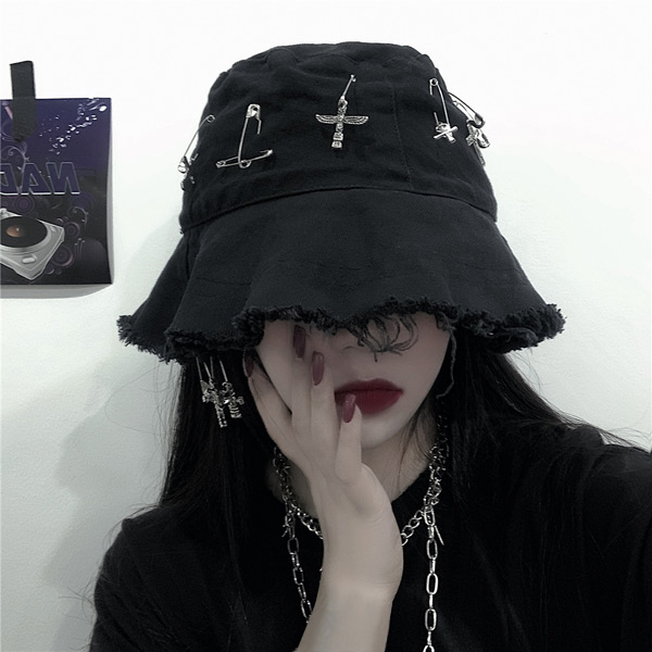 フリンジ バケットハット 安全ピン クロスモチーフ アクセサリー付き ブラック 帽子 ダンス 衣装 ヒップホップ コスチューム 大きいサイズ 個性的 服 韓国ファッション