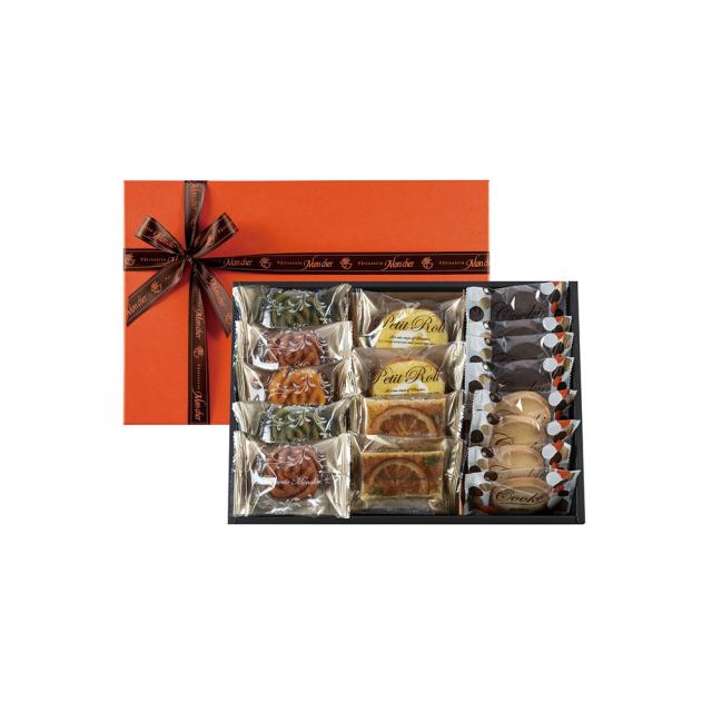 堂島プティロール、バラのフィナンシェ、クッキー、パイが入った焼菓子ボックス。 素材選びから製法に至るまでこだわり抜いた、シェフの自信作ばかりを詰め合わせました。 17点入:サブレバター、サブレショコラ 各4点 堂島プティロール、パイオレンジ、バラのフィナンシェ(フランボワーズ・抹茶) 各2点 バラのフィナンシェ アプリコ 各1点