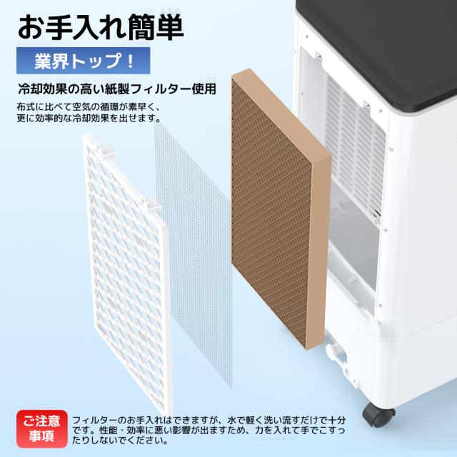 下部水抜きキャップ付き、お掃除の時らくらく、洗って繰り返し使えるフィルターで、いつも衛生的・経済的冷風機。