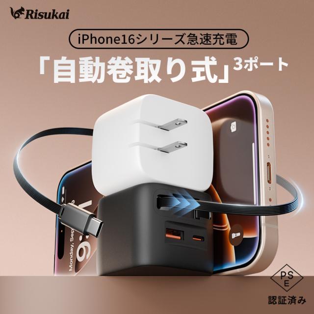 リスカイ★伸縮式充電ケーブル★ Type-C充電ケーブル付き携帯電話充電器 iPhone対応 PD 30W急速充電 USBインターフェース 伸縮式 Lightningケーブル デュアルポートアダプター データケーブル 折りたたみ式プラグ 持ち運び便利&スッキリ収納!
