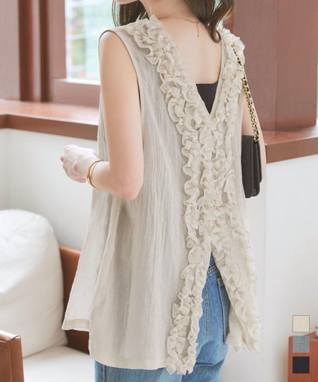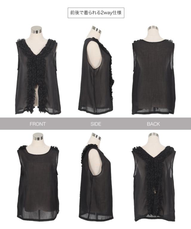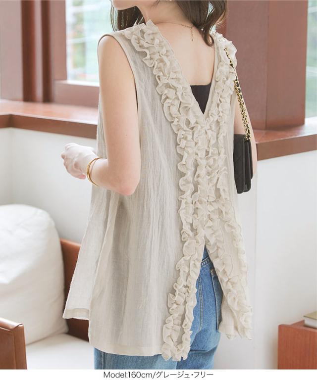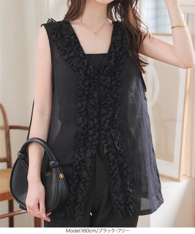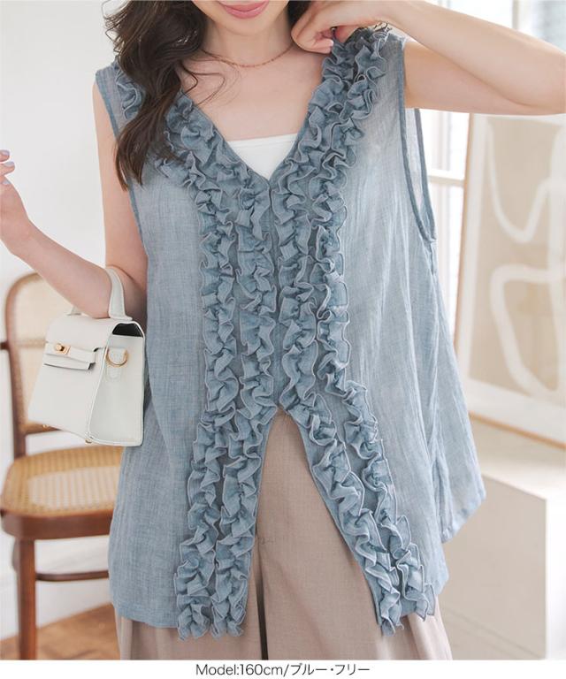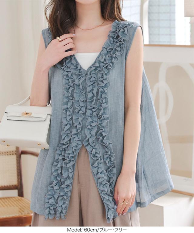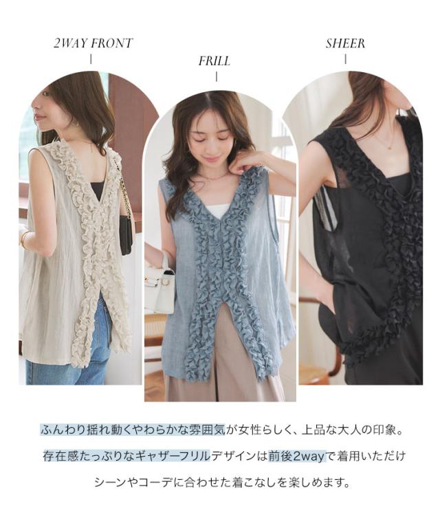 春新作 2wayシアーガーゼフリルジレ C7584 入荷済 レディース 20代 30代 40代 ジレ Vネック フリル レイヤード 重ね着 ガーゼ シアー C7199 ゆったり 楽ちん 大人可愛い 体形カバー ベスト 着痩せ フェミニン Vライン ふりふり お