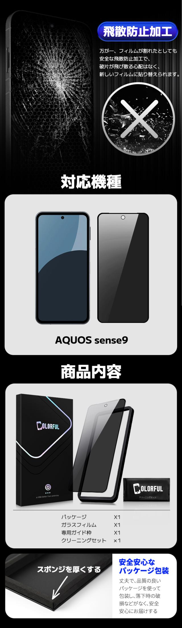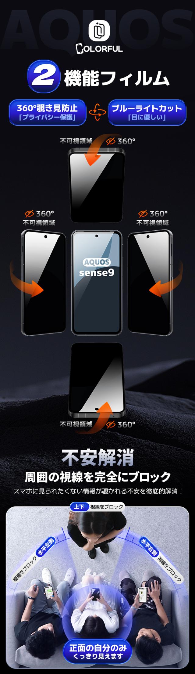 【4方向覗き見防止 + ブルーライトカット 】 AQUOS sense9 ガラスフィルム アクオス センスナイン 保護フィルム docomo SH-53E 液晶フィルム aquos sense9 保護シート 目に優しい ブルーライトカット 覗き見防止 のぞきみ防止 日本製硝子 ガイド枠 簡単貼付 電車 通勤